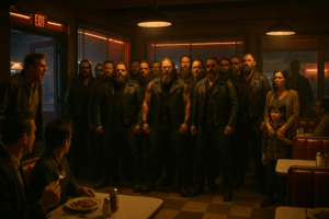 One by one, fifteen bikers rose to their feet. Boots thudded against the tile, leather creaked, and their collective presence was like a wall of steel.