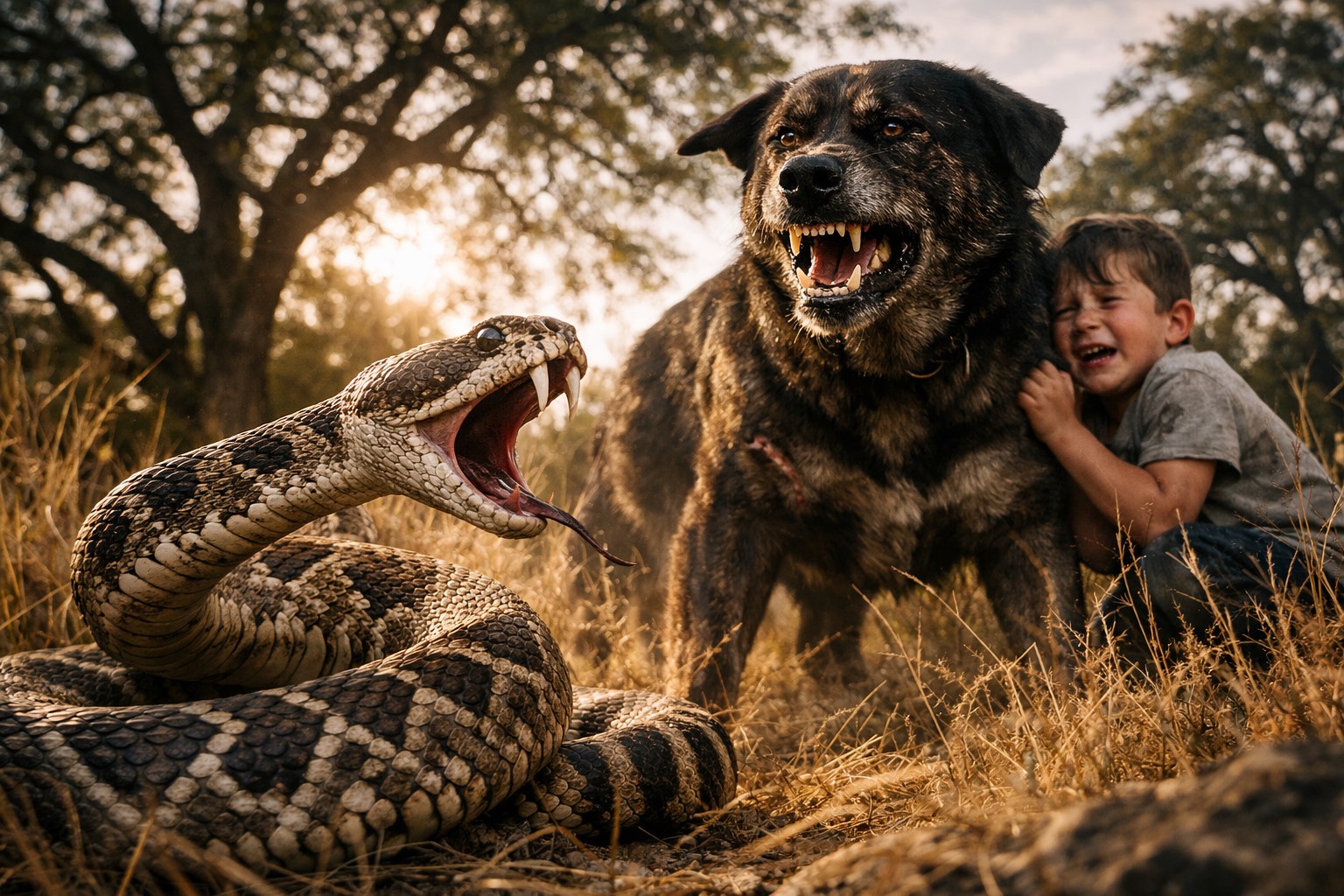The snake’s fangs sank deep into the dog’s shoulder, pumping lethal venom into its brave heart.